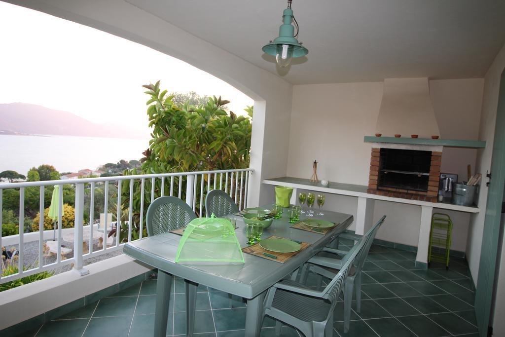 Une terrasse avec barbecue et splendide vue sur la mer.